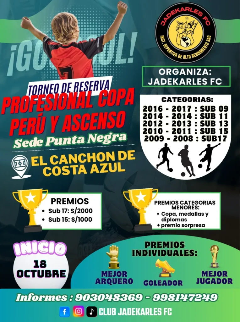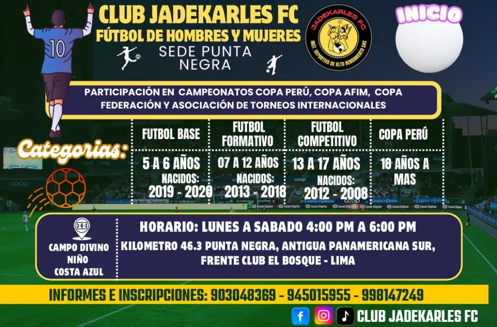 En la sede de Punta Negra, Jadekarles FC ofrece un espacio único para el desarrollo futbolístico de alto nivel. El entorno natural, sumado a una metodología profesional, crea una experiencia formativa completa, donde cada jugador aprende a competir con inteligencia, esfuerzo y carácter. Si estás en Punta Negra, San Bartolo, Punta Hermosa, Lurín o alrededores, esta es tu sede. Porque el talento del sur también merece llegar al alto rendimiento.